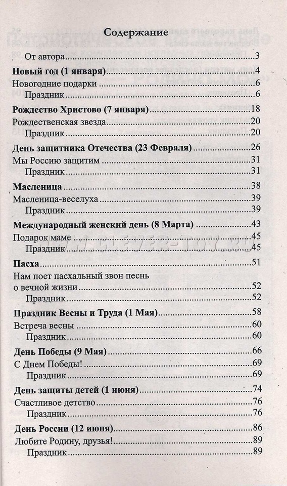 Содержание книги включает беседы о таких праздниках, как Новый год, День Победы, День защиты детей, Дню России, которые выстроены в хронологической последовательности. Представленный материал направлен на социальное развитие дошкольников и воспитание патриотизма.