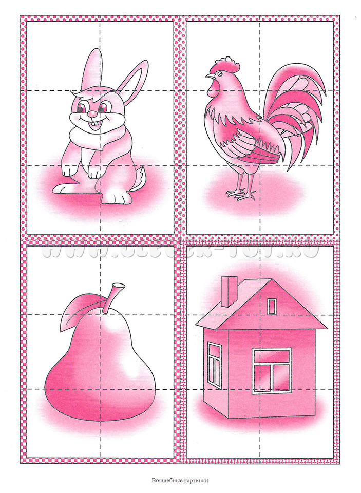 Внутри имеются цветные вкладыши, перед игрой картинки необходимо разрезать по пунктирным линиям. Части каждой игры сложите в конверт, чтобы они не перепутались. Предложите ребенку новую игру - собрать пазлы (части картинки).