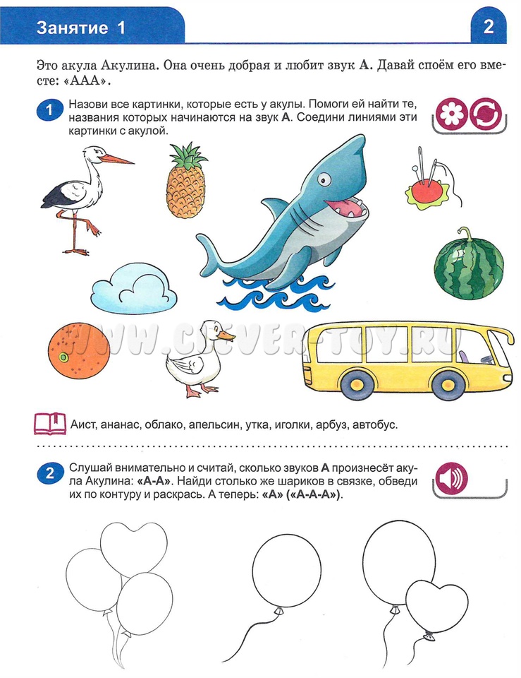 Дети постепенно осваивают операции звукового и слогового анализа и синтеза, понятия "звуки", "слоги", "слова", знакомятся с характеристиками звуков. Предложен особый порядок изучения букв и звуков, который учитывает следующее правило: нельзя давать графический образ буквы и упражнения со звуком, если ребёнок неправильно его произносит.