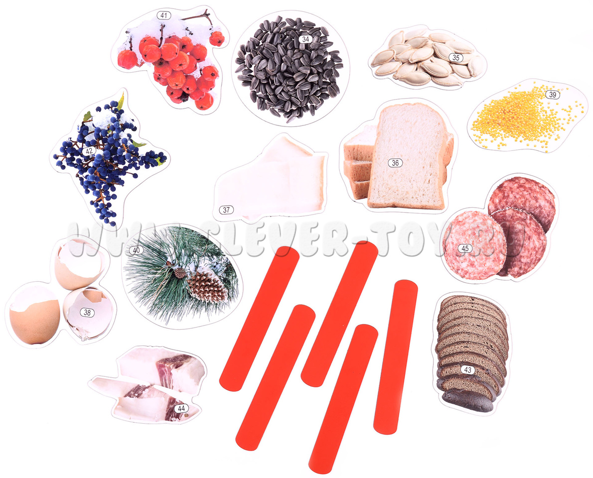 Карточки с изображениями: 34 семена подсолнечника; 35 семена тыквы; 36 крошки белого хлеба; 37 кусочки сала; 38 яичная скорлупа; 39 пшено; 40 орешки из шишек; 41 ягоды рябины; 42 ягоды бузины; 43 черный хлеб; 44 солёное сало; 45 колбаса; 46-50 красные магнитные полоски для зачёркивания тех продуктов, которые нельзя давать птицам.