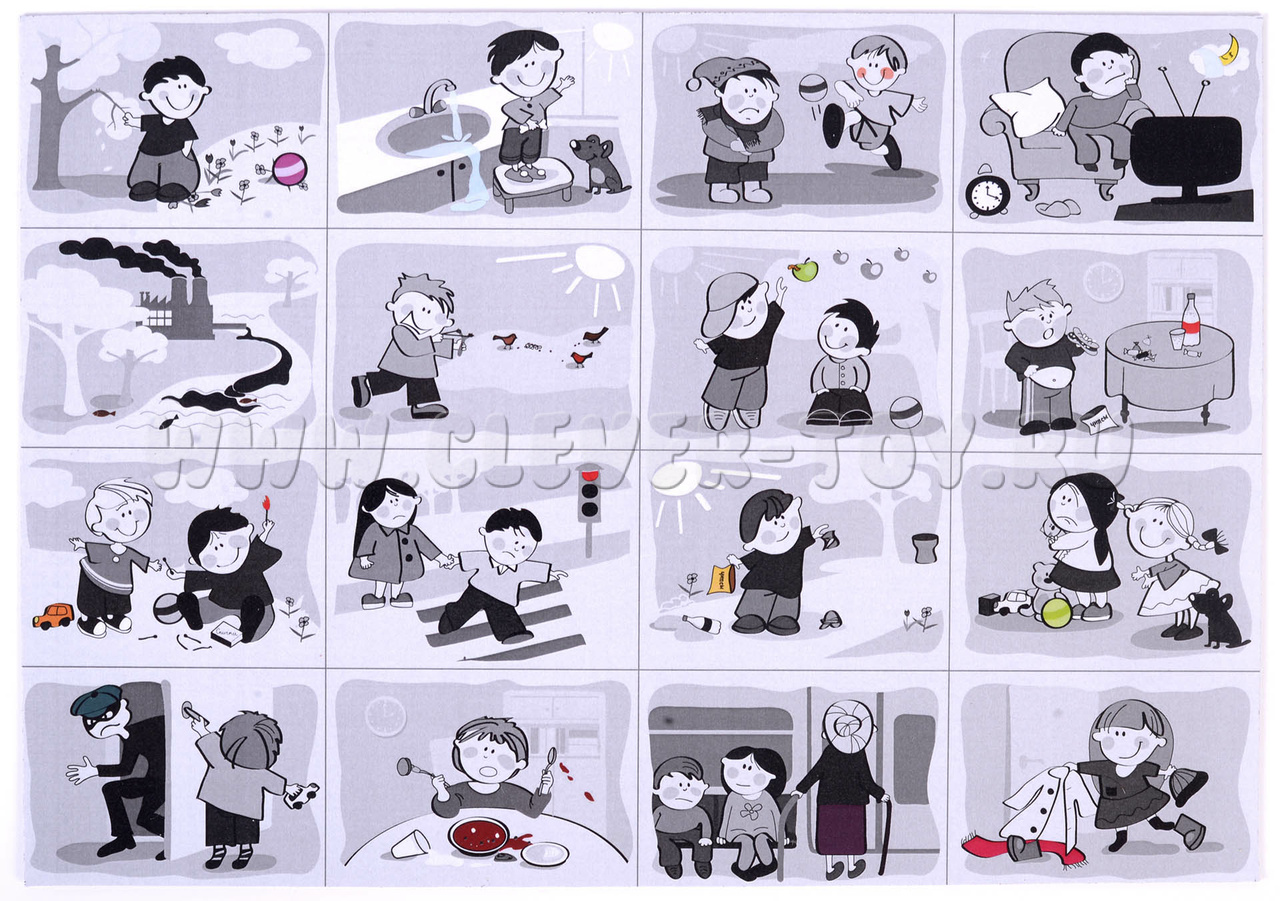 Задача - найти противоположные по значению пары, исходя из принципа: "это - плохо, а это - хорошо". Одной черно-белой картинке на поле должна соответствовать одна цветная картинка на карточке. Положите цветную карточку на черно-белую картинку так, чтобы она примагнитилась.