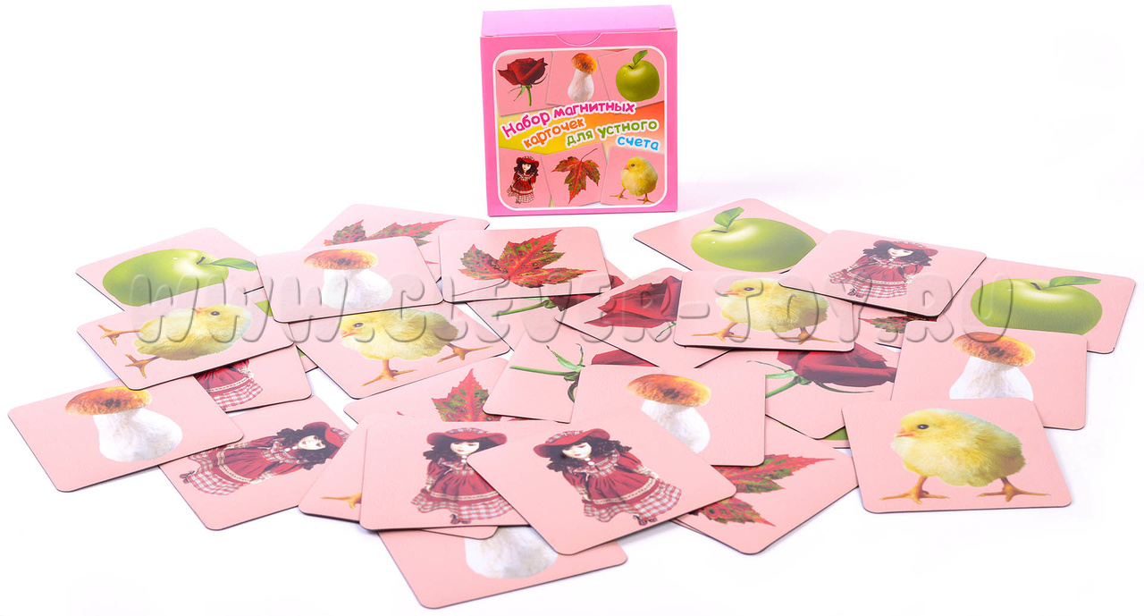 Набор состоит из 30 карточек размером 7х7 см. На розовом фоне изображены 6 картинок: роза, яблоко, лист, цыплёнок, кукла и гриб.