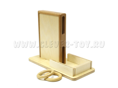 Игра является отличным развивающим пособием для самых маленьких. Ребенок отпускает деревянное колечко в верхнюю прорезь и наблюдает, как оно выкатывается из нижней прорези.