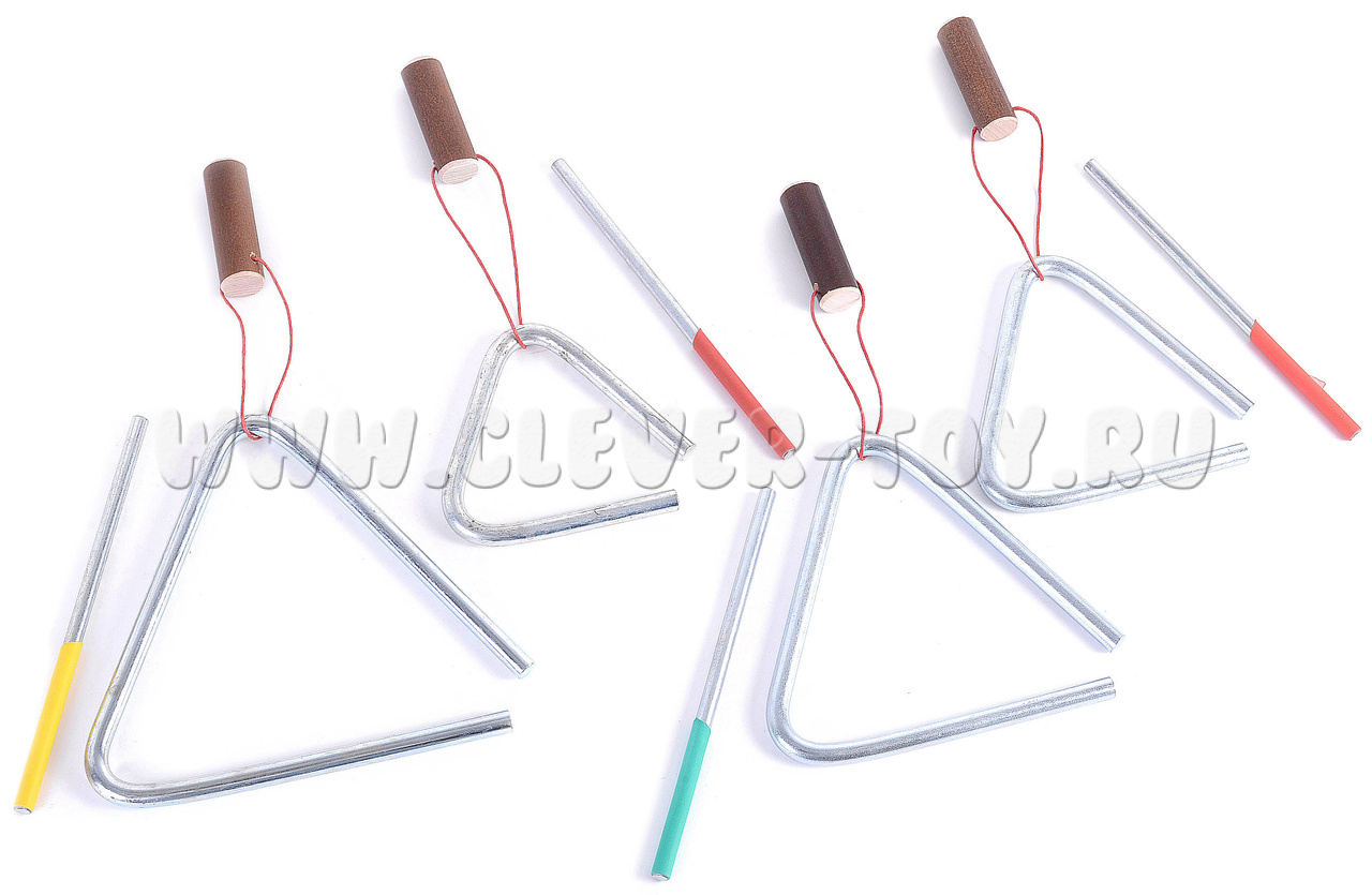 4 музыкальных треугольника (длина стороны - 8, 10, 12, 14 см) с качественной тембральной окраской, благородным и певучим звуком (до 20 секунд).