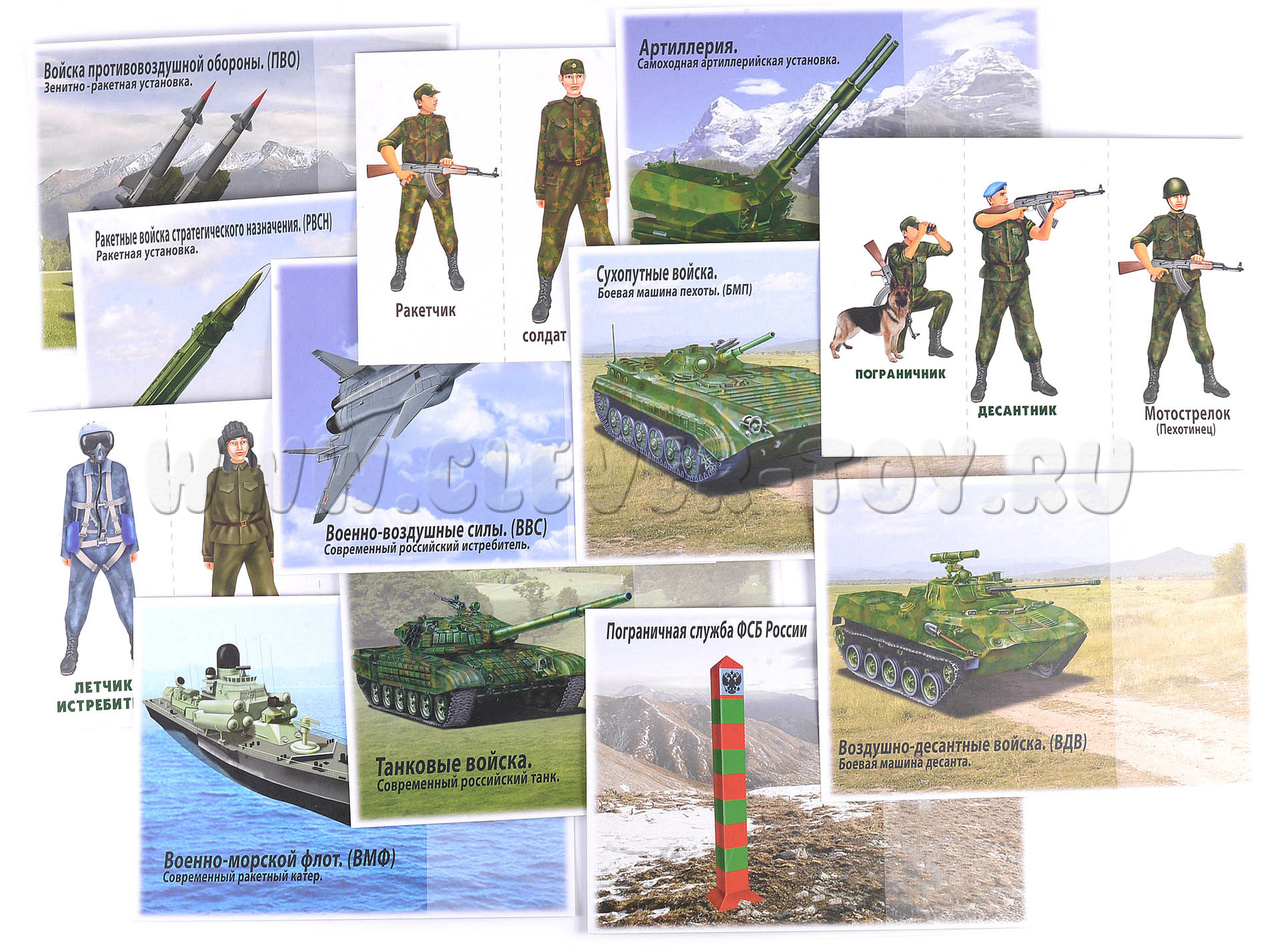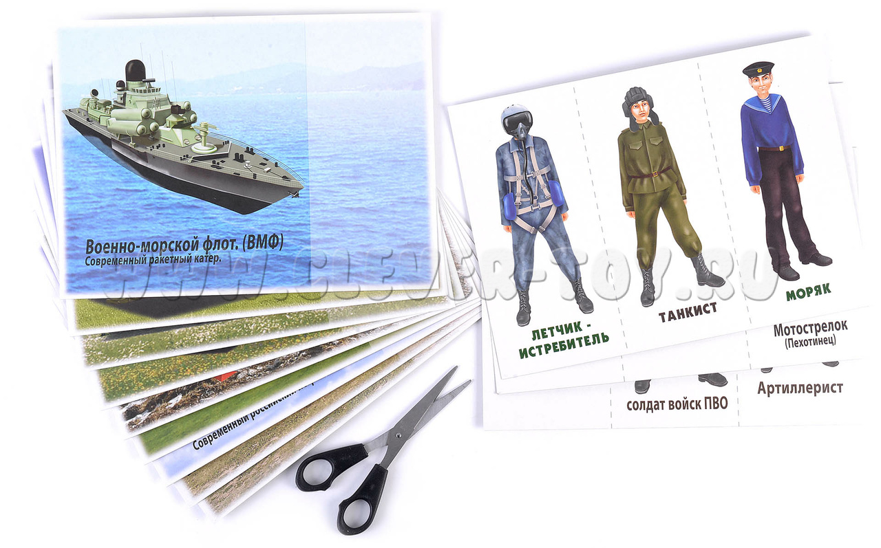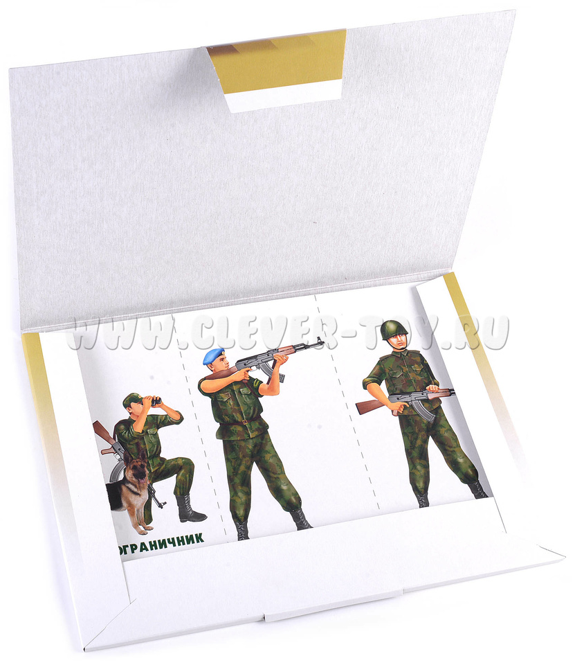 Пособие подходит для занятий в группах детского сада, а также индивидуально. Перед началом занятий необходимо разрезать карты с изображением солдат по пунктирным линиям. Ребенок раскладывает их на больших картах соответствующих родов войск.