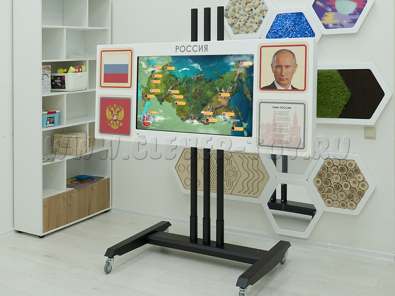 Настенная интерактивная панель с сенсорным монитором, декорированная основной символикой РФ: герб, флаг, гимн, портрет президента. Разработана для реализации программы патриотического воспитания в школе, детском саду или других образовательных учреждениях. Подходит для оформления входной зоны и классов.