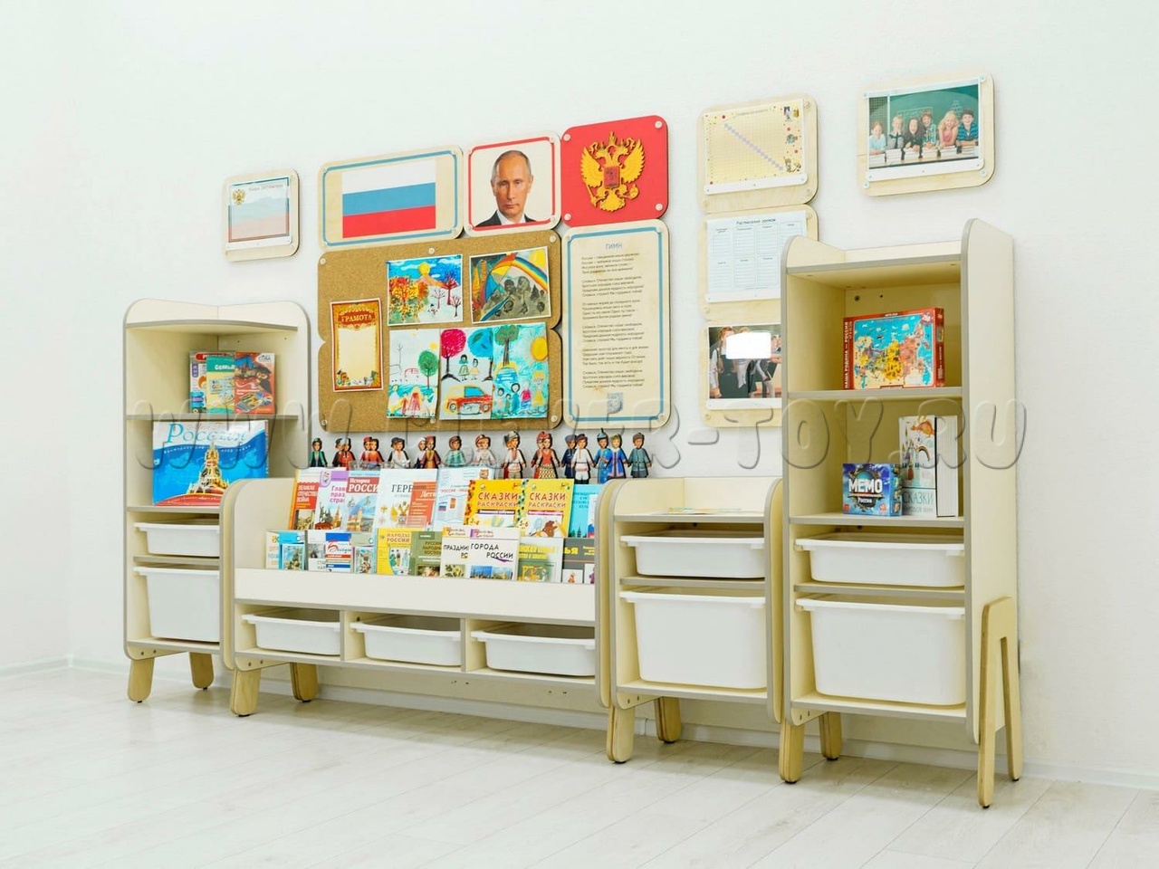 Уголок по патриотическому воспитанию для группы детского сада. Содержит основную символику РФ, панели для размещения работ воспитанников, набор разборных кукол, контейнеры для размещения книг. Соответствует требованиям ФГОС 3.