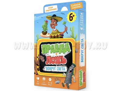 Познавательная карточная игра с 50 фактами и "обманками" о странах и их жителях, красочные иллюстрации.