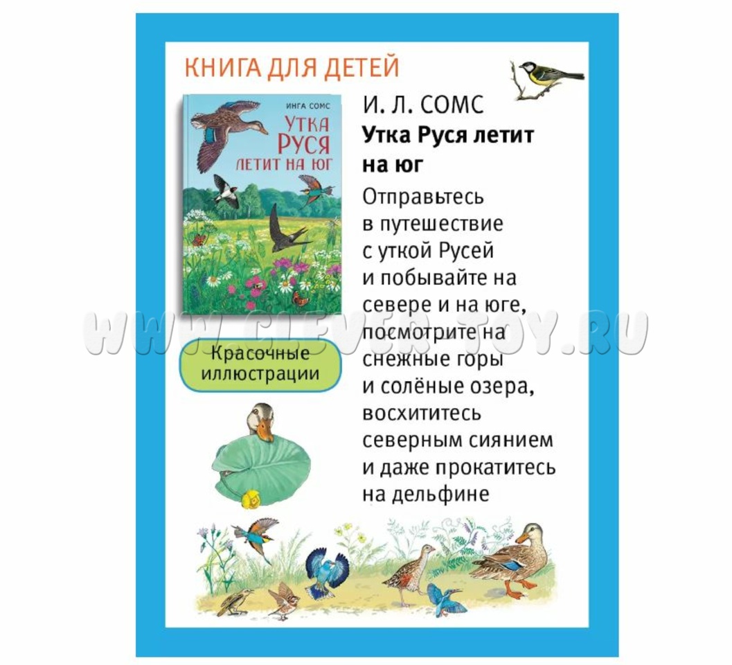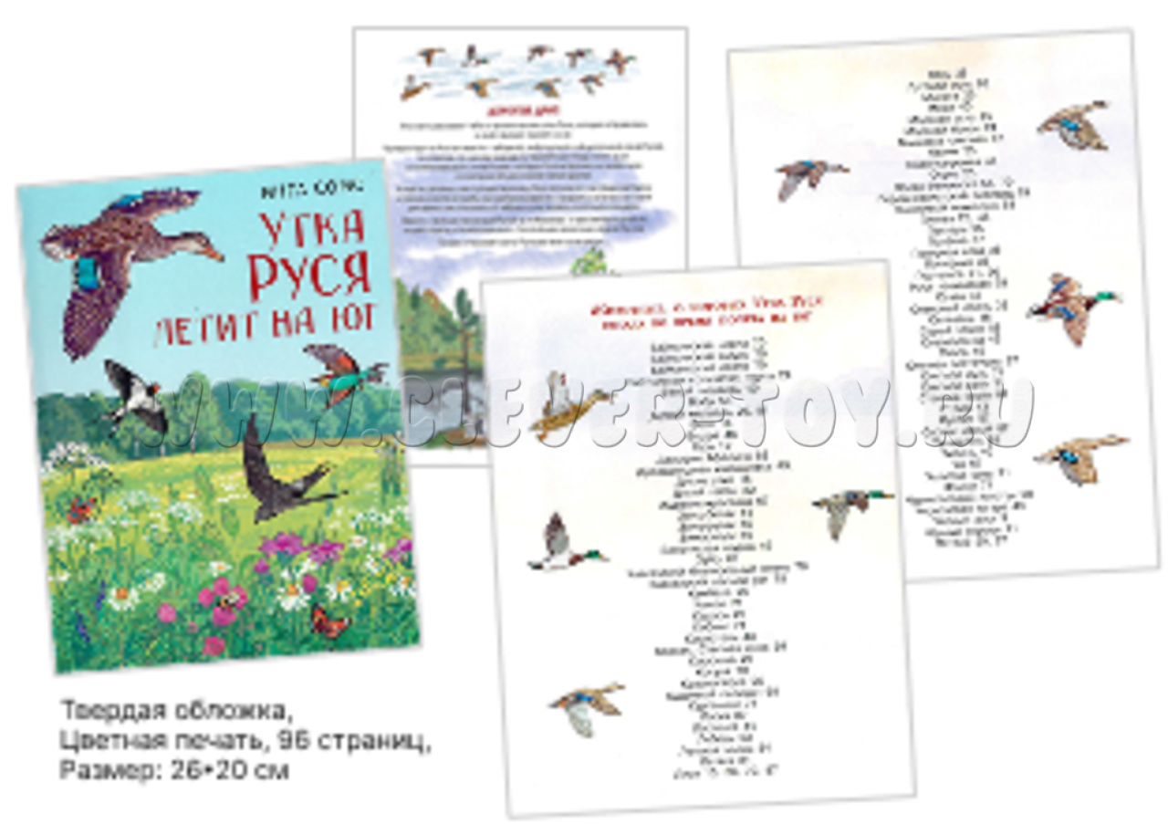 - Познавательная книга Инги Сомс "Утка Руся летит на юг" (Твердая обложка, Цветная печать, 96 страниц, Размер: 26*20 см).