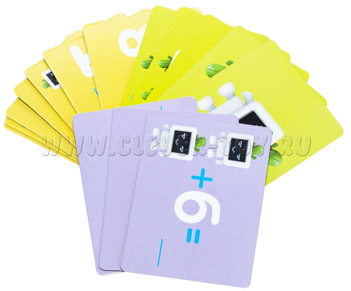 Зеленые карточки – начальный уровень. Ребенок изучает цифры. Положив на одну чашу весов цифру, ребенок должен найти баланс, с помощью такого же равного цифре количеству роботов.