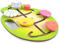 Игра «Накорми зайку» представляет собой лабиринт, состоящий из деревянного поля и фишек (капуста, морковка, яблоко, редиска) разделённые пополам, которые движутся по пазам.