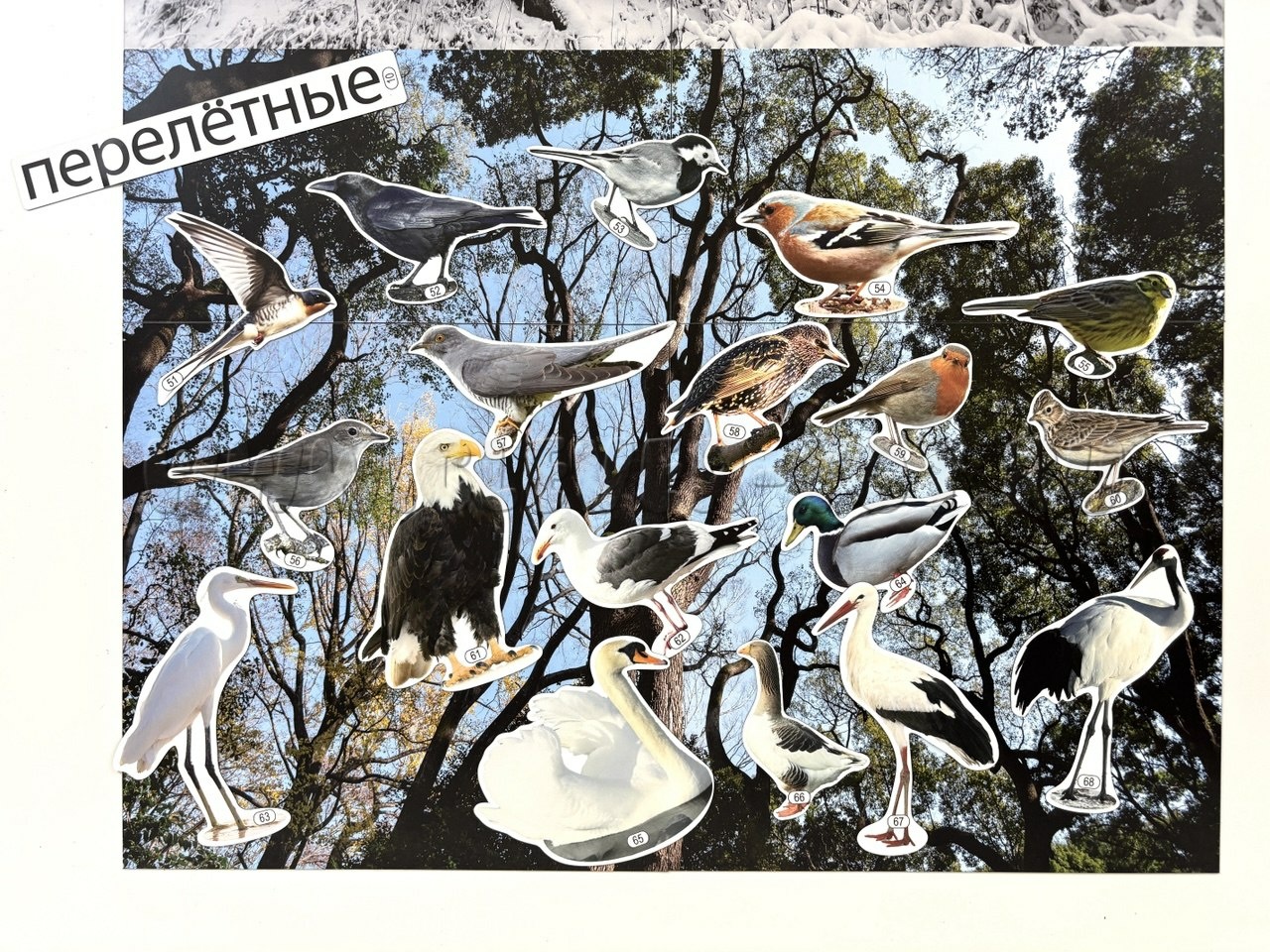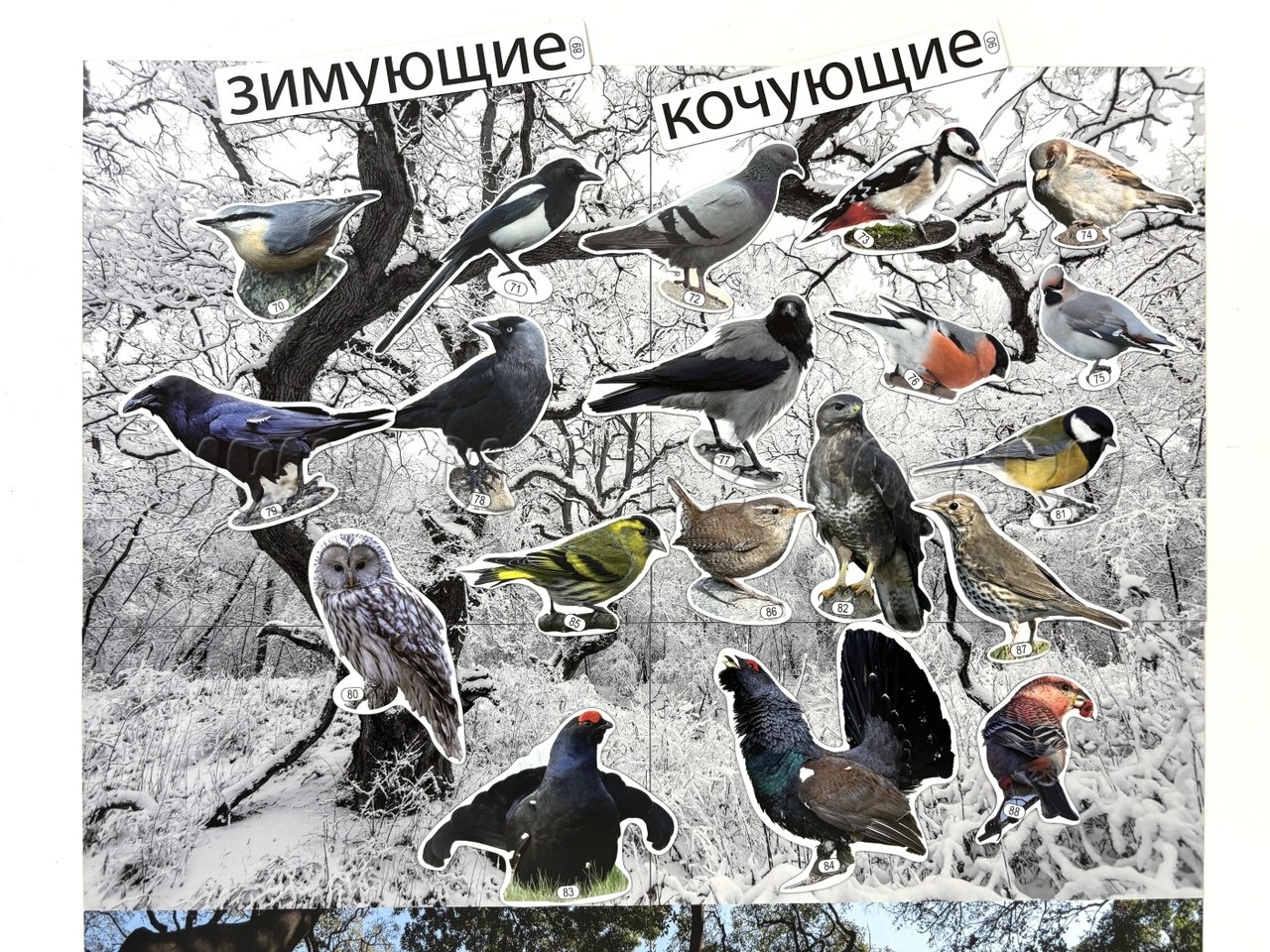 В комплекте к плакату идут магнитные карточки, объединённые по разным темам: "Кто такие птицы?", "Как помочь птицам зимой? Развешиваем кормушки", "Что едят птицы зимой?", "Перелётные птицы" и другие.