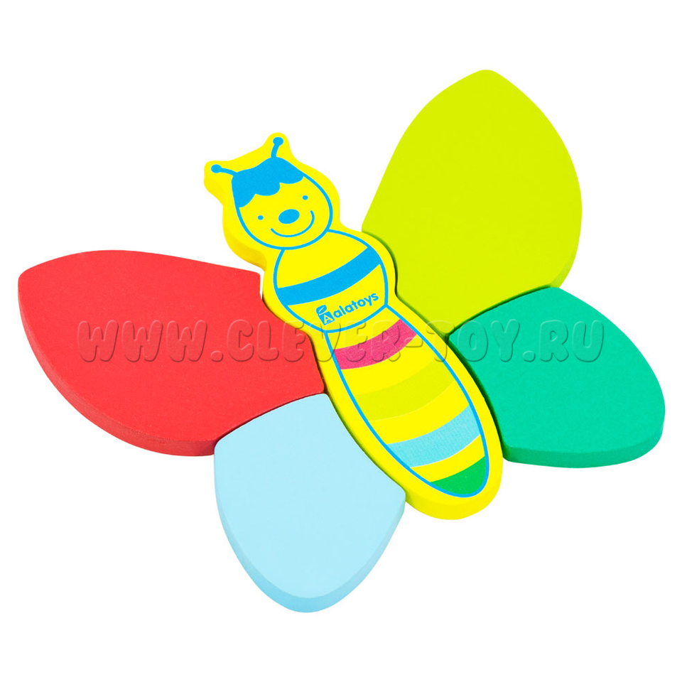 - 5-ти разноцветных деталей, из которых складывается фигурка бабочки (голова и туловище с нарисованной улыбчивой мордочкой, 4 крылышка), окрашенных вжёлтый, голубой, тёмно- и светло зелёный, красный цвета.