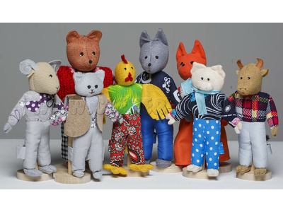 Перед вами - передвижной театр “Зимовье”, включающий следующих персонажей: баран, медведь, кот, петух, волк, лиса, поросенок, бык.