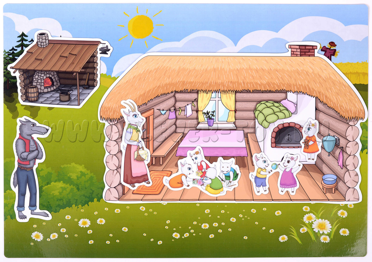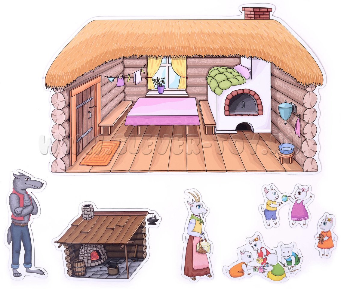 Размер карточек: 32 см х 19 см (изба), 5 см х 2,5 см (козлёнок).