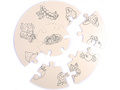 2. Игра с цветным фоном. На обратной стороне каждого пазла на цветном фоне вы найдете черно-белые контуры предметов, разделенные пополам. Предложите ребенку собрать круг в верном порядке (линии не должны прерываться, изображение должно получаться целым);