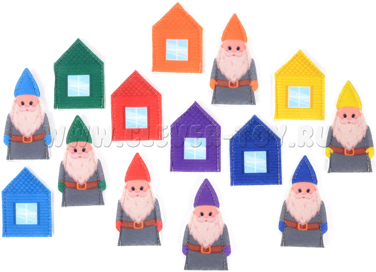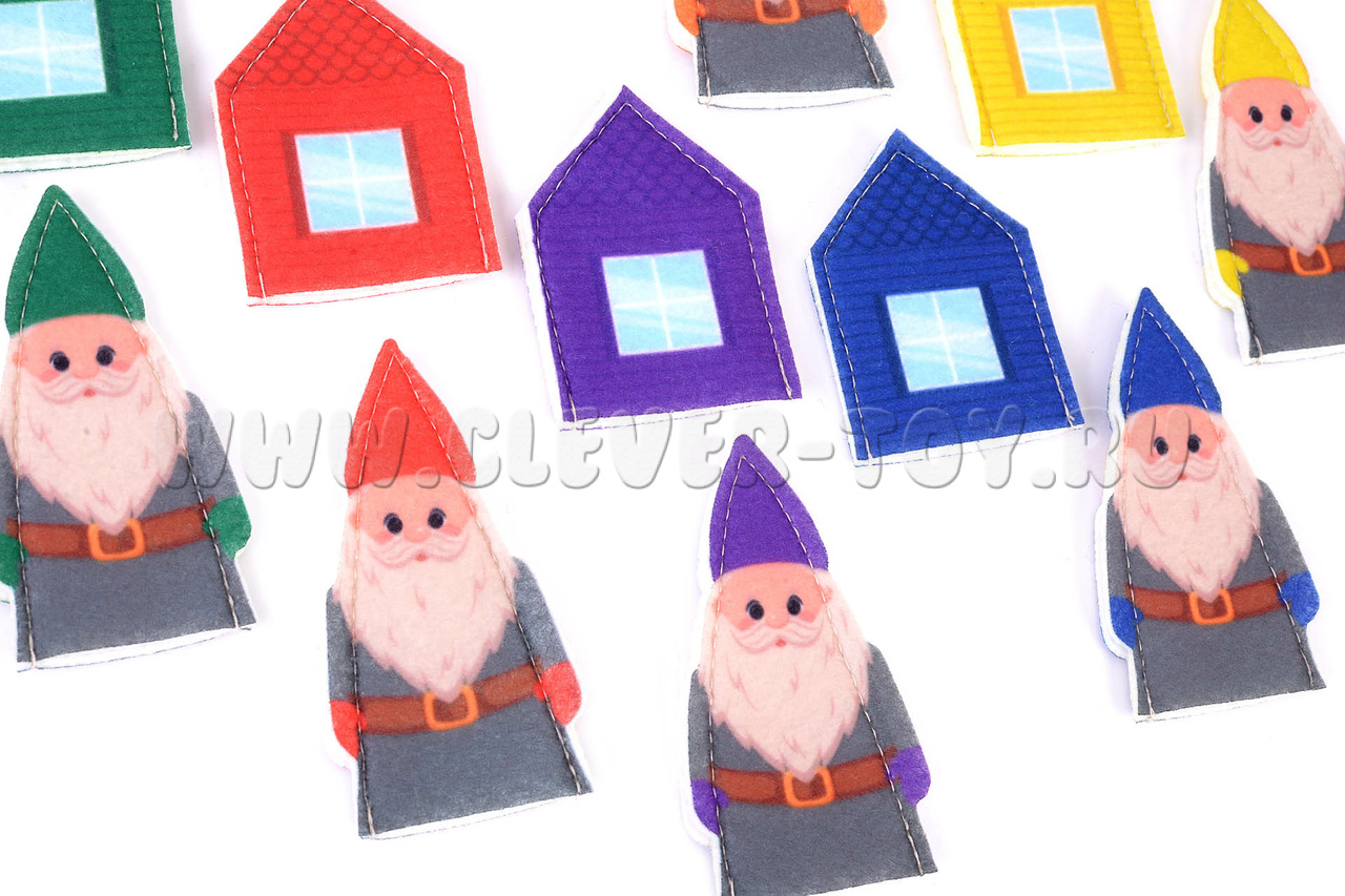 Набор включает 14 элементов из фетра: 7 гномиков и 7 домиков.