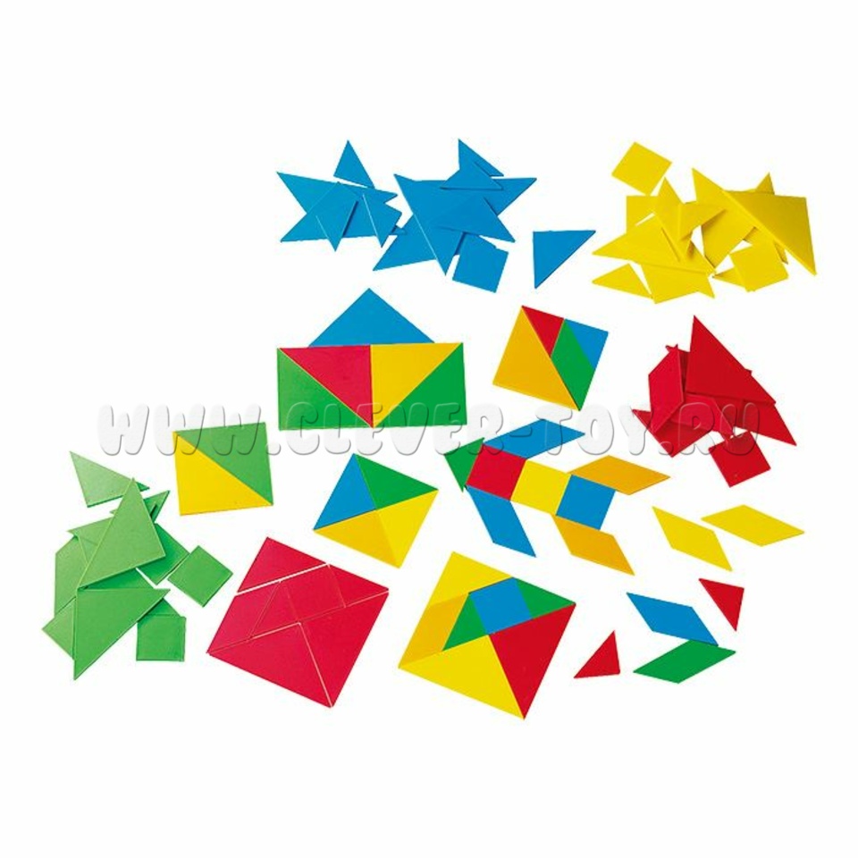 Состав набора: 30 больших треугольников; 30 маленьких треугольников; 15 средних треугольников; 15 квадратов; 15 параллелограммов; Инструкция.